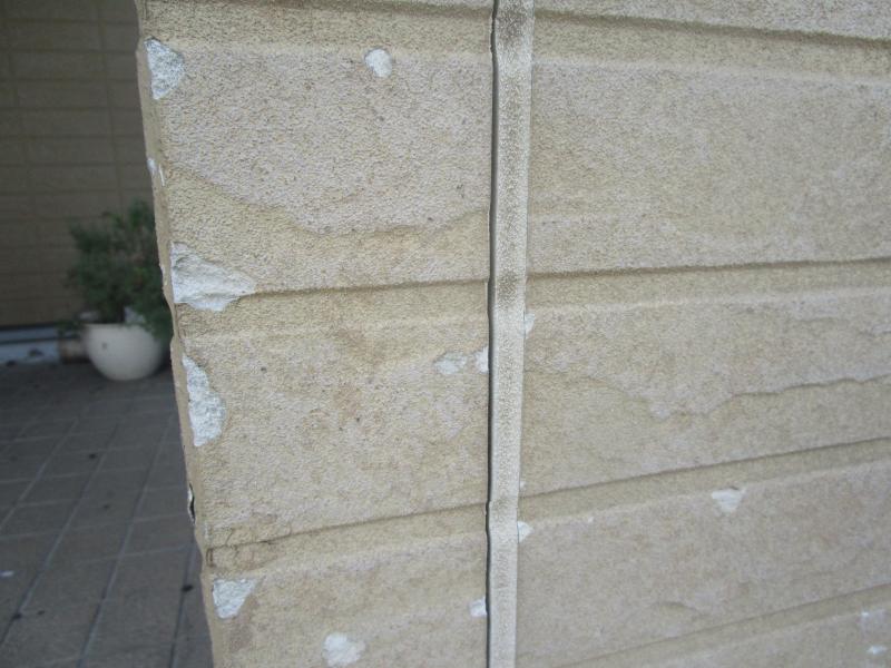 外壁材はこのように表面が剥がれてきており、コーキングも劣化しひび割れや剥がれが見られました。最初は小さな傷みですが、放って置くと次第に大きくなり、外壁の役割の一つである防水性能が低下してしまう原因になります。
