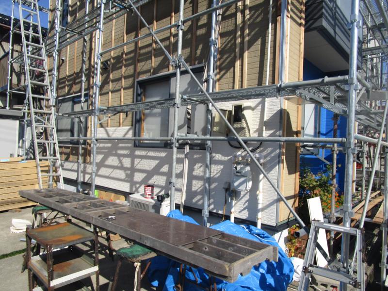 壁面に見える木材は、下地胴縁といって、金属サイディングを取り付ける下地になるものです。既存の外壁との隙間ができ、断熱性が向上します。既存の外壁を撤去することなく工事を進めることができますので、工期を短くできゴミも少なくてすみます。サイディング材をどんどん張っていきます。