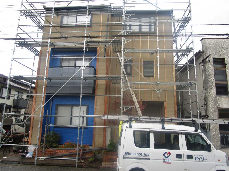 隣接する建物にも配慮しながら足場をたてます。3階建ての建物でも難なく足場を設置していきます。手際の良い職人さんがどんどん組み立てていき、およそ1日で出来上がってしまいます。