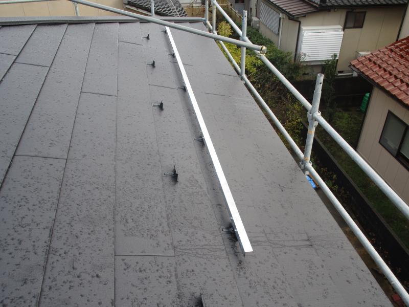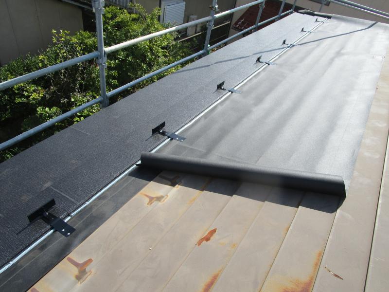 ルーフィングシートを敷いていき、その上から高耐久なガルテクトを重ねて葺いていきます。同時に新しい雪止めを同時に設置していきます。