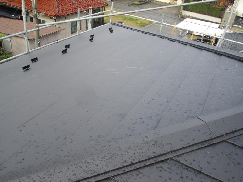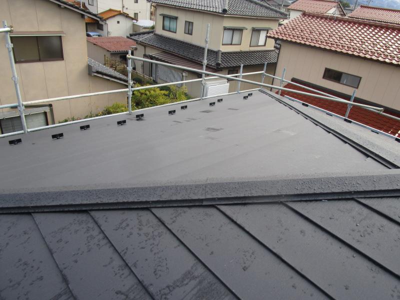 スーパーガルテクトで重ね葺きした屋根です。重ねて葺くカバー工法は、廃材が少なく、既存の屋根を剥がす工程も省略できるため、コストも工期も圧縮できる優れた工法です。