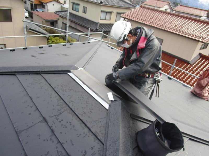 手慣れた様子で職人が棟板金部分を施工していきます。手早く、かつ丁寧な仕事ぶりでした。