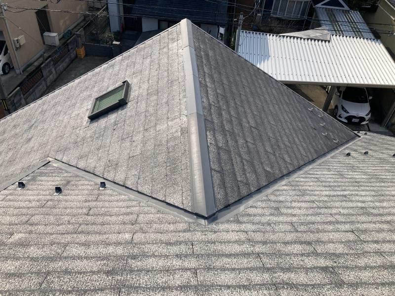 外壁側の屋根材は、普段つよい西日が当たりづらく剥がれが少ないです。目で見てわかる程、劣化の違いがはっきりとしています。