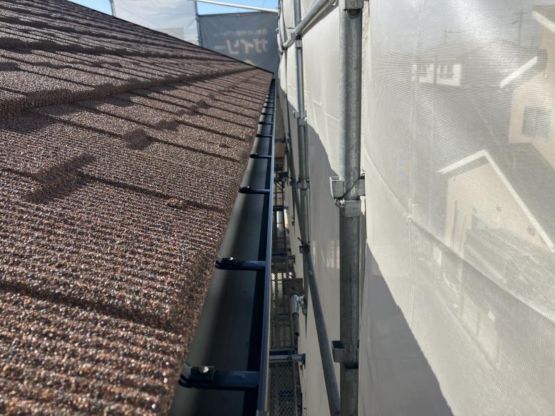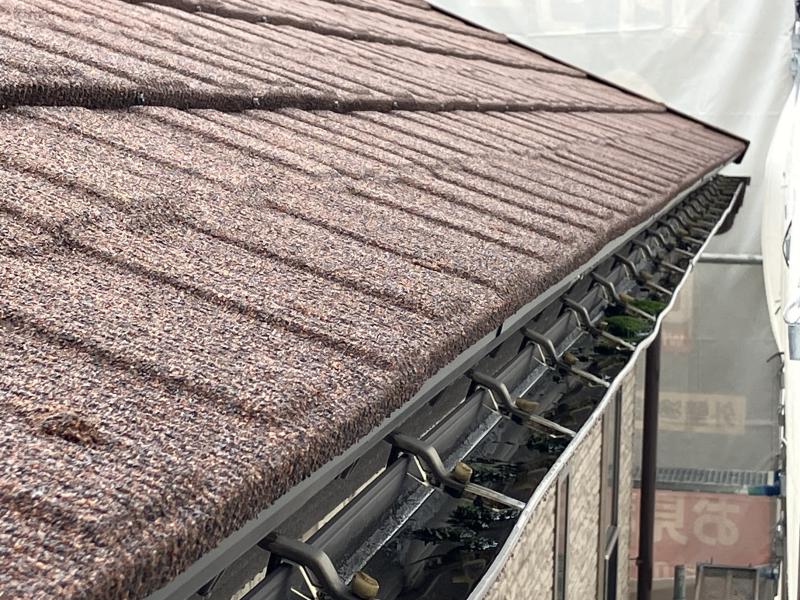 今回屋根工事のみの請負でしたが、足場を組み実際上がってみると雨樋(軒樋)が変形し大量のコケが溜まり雨水が流れない状況になっていました。
